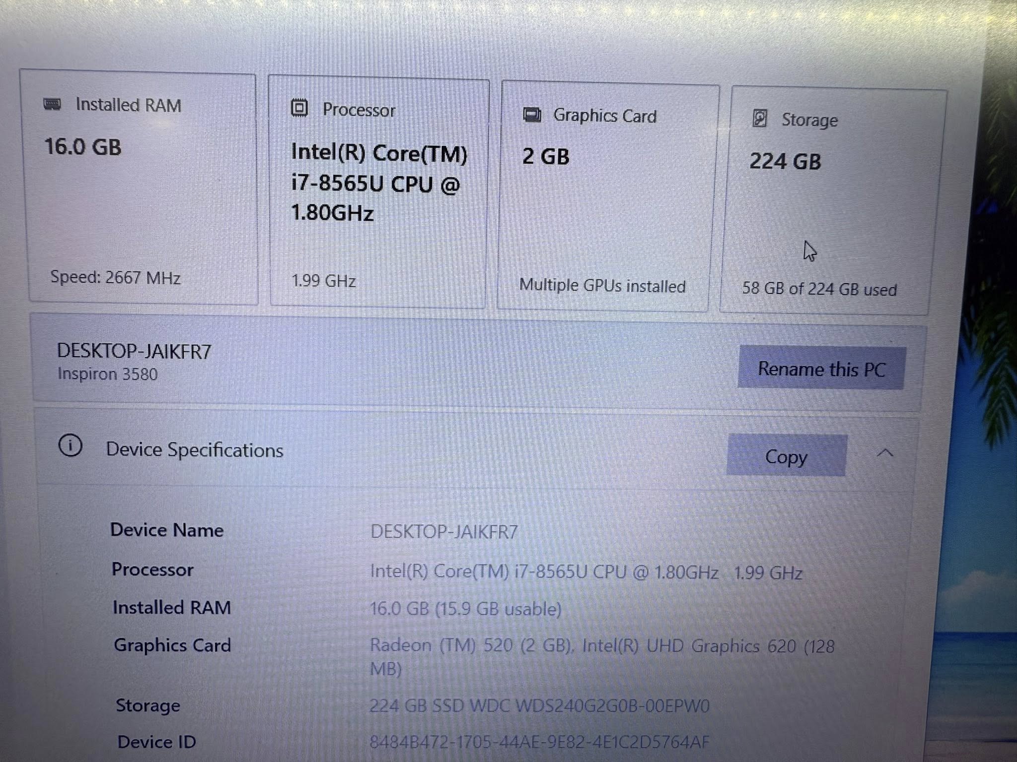 Dell 3580 i7 8565/16G/256G/VGA 2G/15.6 FHD
