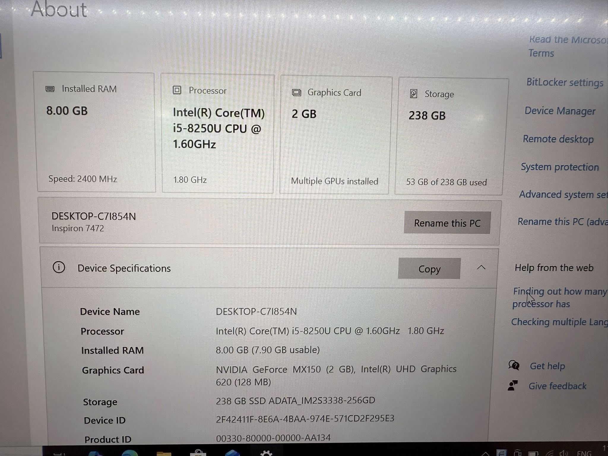 Mã sản phẩm: Dell Insprion 7472 Màu Silver máy 99% I5 8250/8G/256G/VGA 2G/14.0FHD full nhôm + led phím